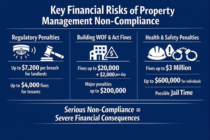 New Zealand law now treats many landlords and bodies corporate as PCBUs (Persons Conducting a Business or Undertaking) under the Health and Safety at Work Act 2015; that means directors and decision-makers can personally face penalties if they allow unsafe conditions to persist. Understanding the cost of non-compliance is therefore essential to any modern property compliance strategy.